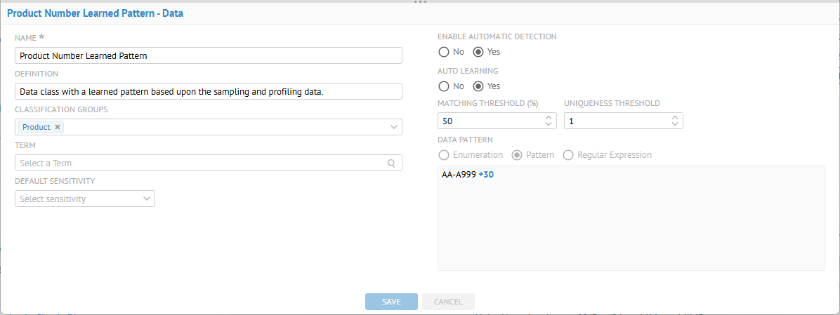 The Product Number Learned Pattern data class is now assigned to this field, as well.