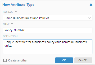 Enter "Policy Number" in the NAME and "Unique identifier for a business policy valid across all business unites." in the DEFINITION. Then click OK.