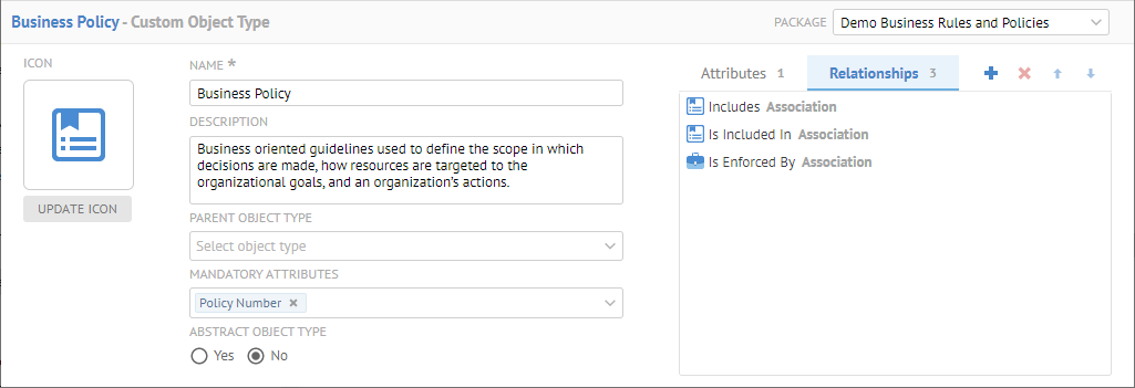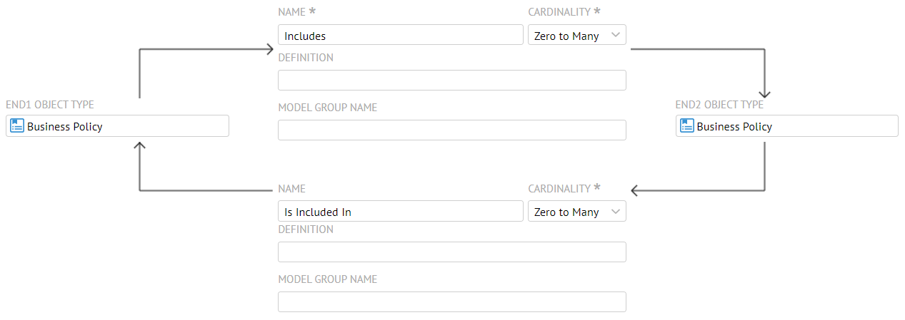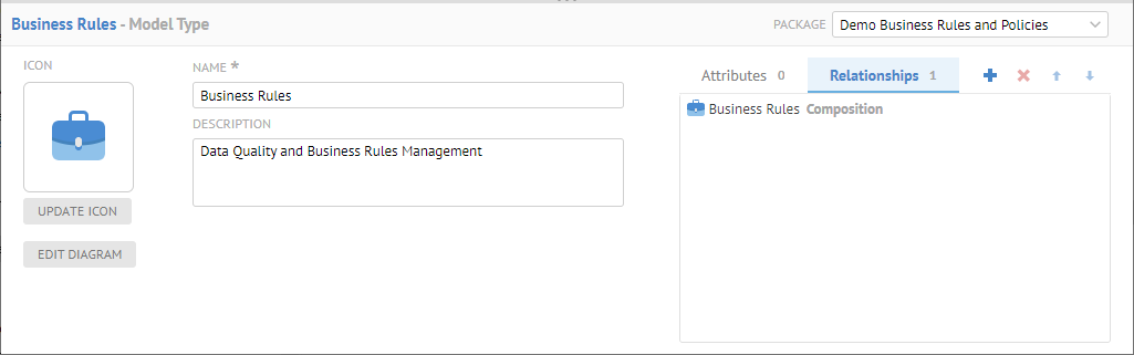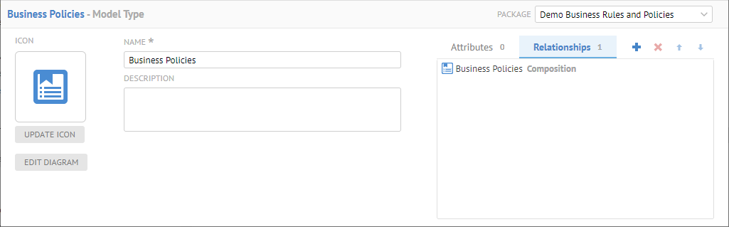 We may only select the composition relationship so that the model will be composed of the objects, in this case Business Policies. As with other composition relationships, the UI will understand that this it should be presented as a hierarchy.