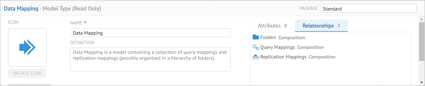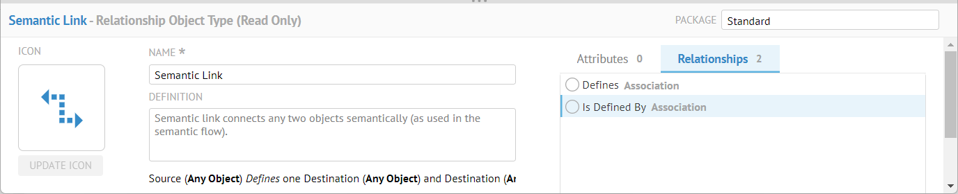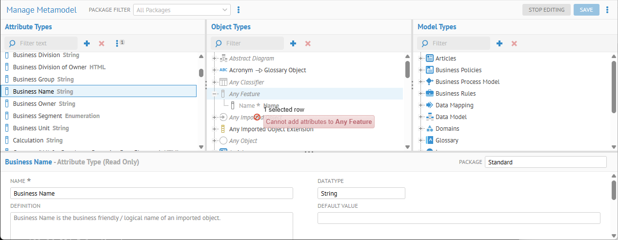 The product comes with the Standard package. The standard package is special. It contains types that cannot be renamed, removed from the standard parent, or deleted from the metamodel. The product relies on the presence of these types for its functionality. You can extend standard types by adding new attributes and objects to them.