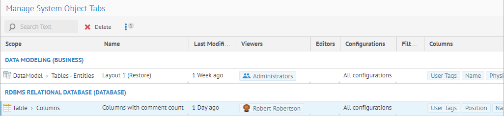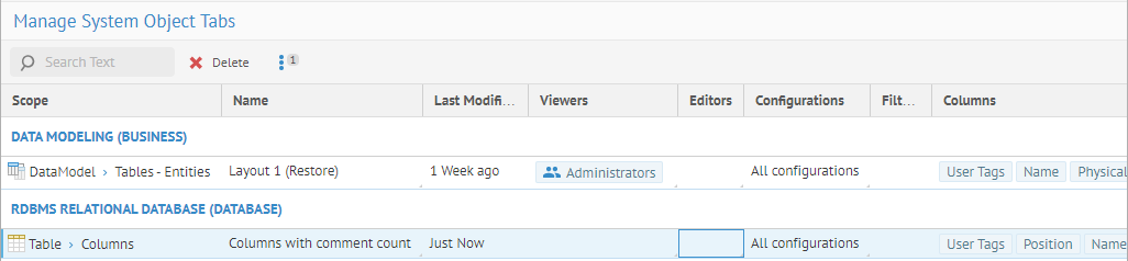 These customized object tabs are defined by object type (e.g., table, column, schema, report, etc.). One may manage the system type object tabs which when shared can be the default tabs (on the object page) for various users and groups of user.