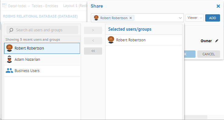 Click Share and pick the user Robert Robinson to share this system object tab with as a Viewer.