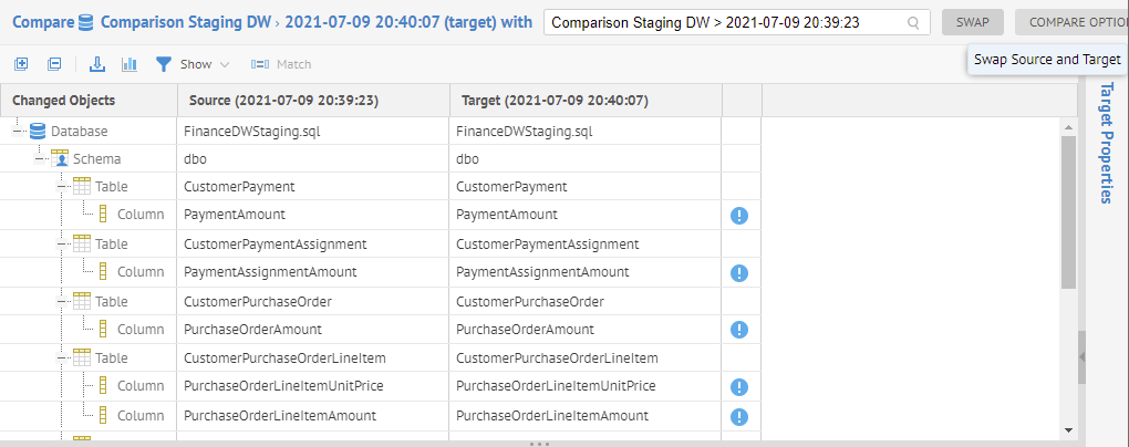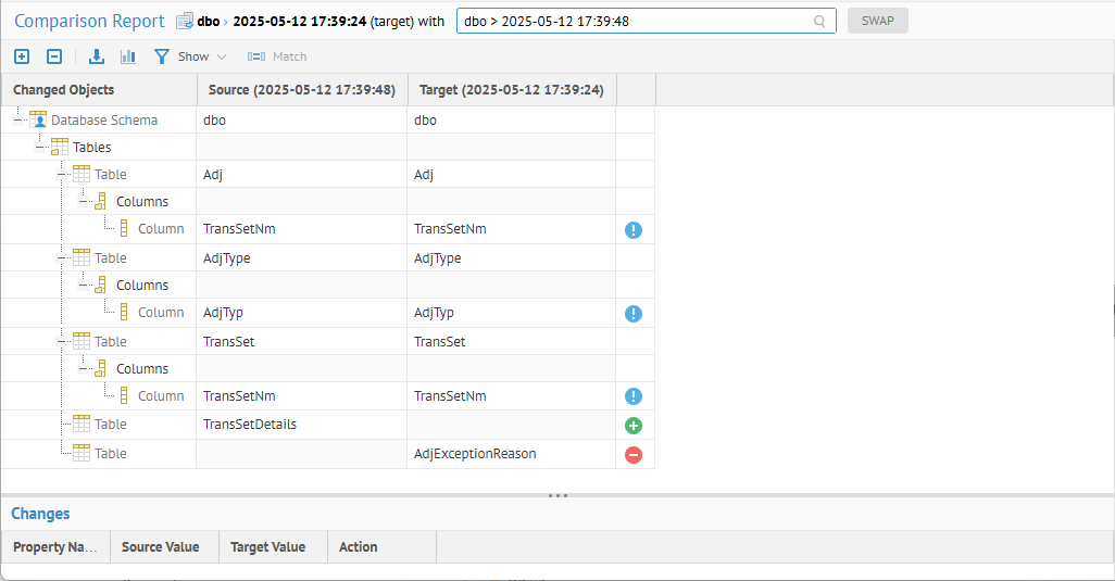 Note, there are two Catalog level objects with names based upon the year they were valid for. Unfortunately, this difference in name means that the comparison reports that these are two separate objects and does not try to compare their contained objects. You may select both rows (Adjustments2025.sql and Adjustments2024.sql) and the right-click and select the Match option to inform the comparator that they should be treated as equivalent and thus perform the comparison on the contained objects (e.g., tables in the schema).
