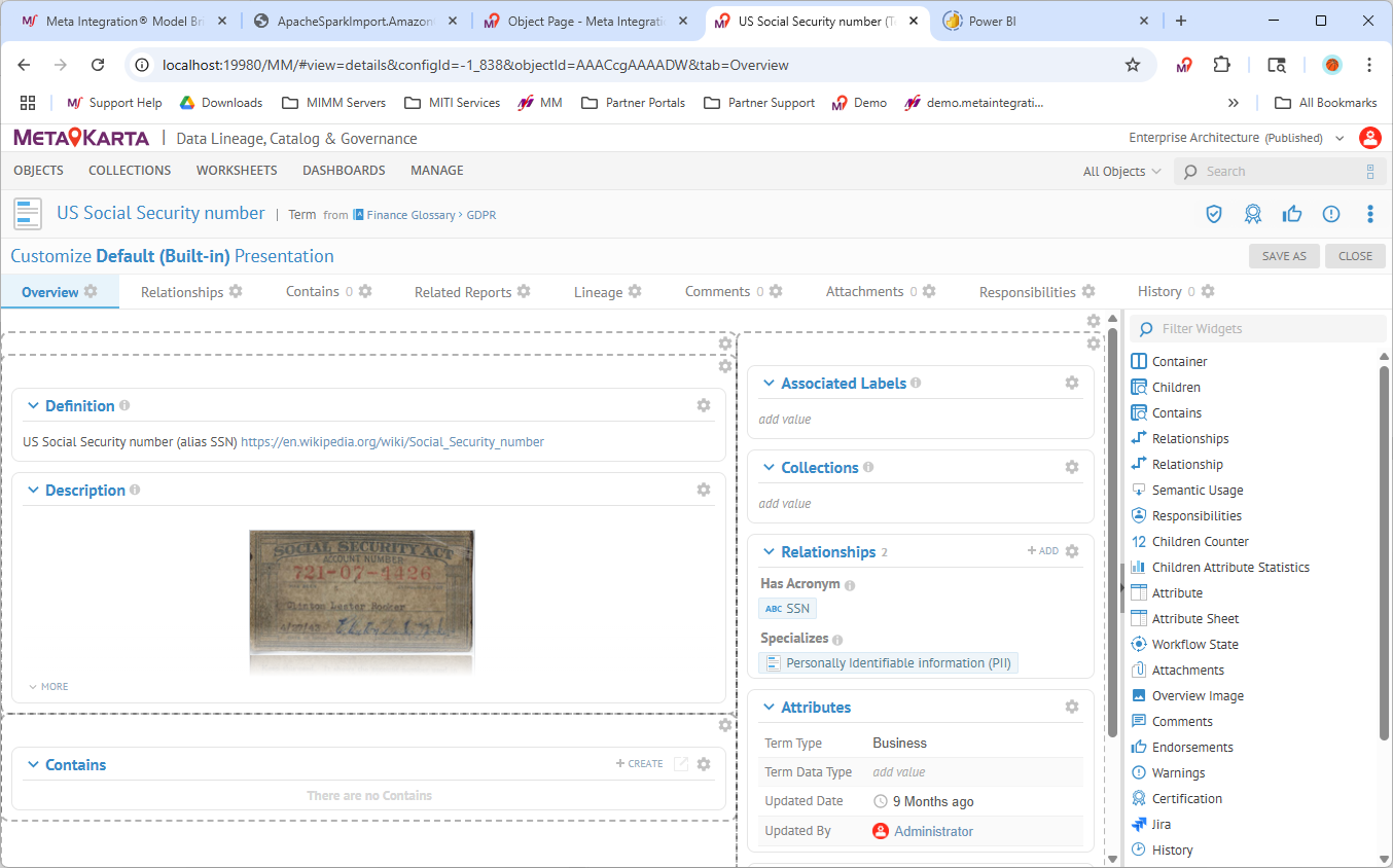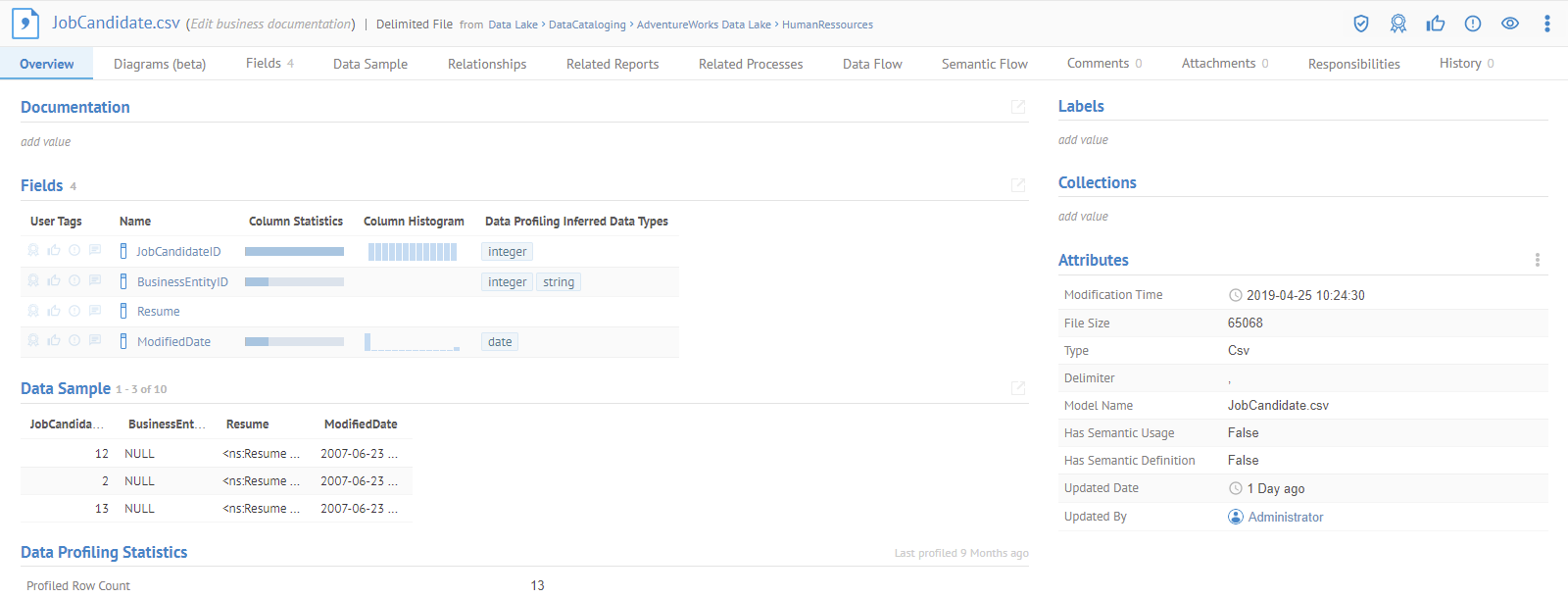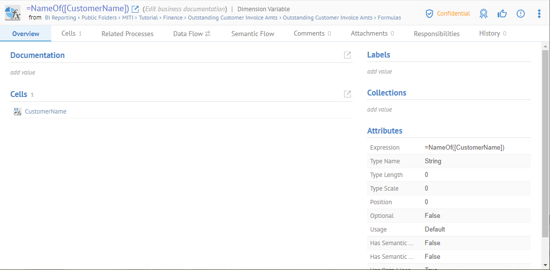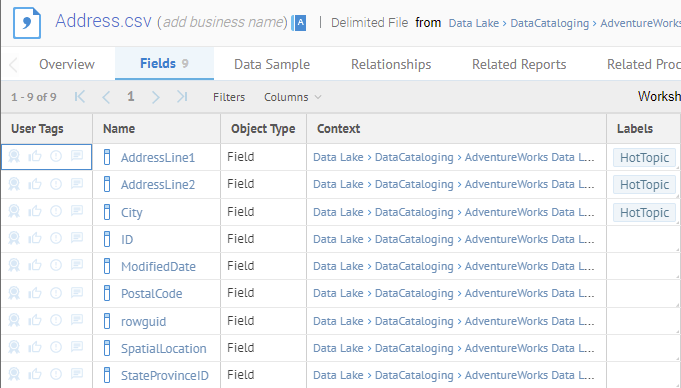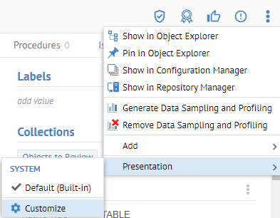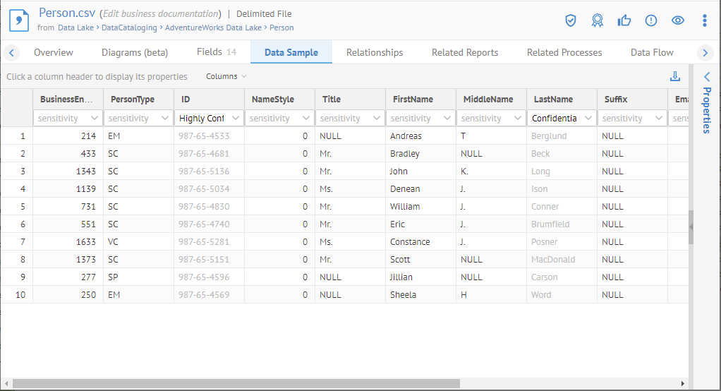 The sensitivity label feature allows you apply a sensitivity label to any imported object. Sensitivity applies to the data sampling and profiling information, not the metadata. Each sensitivity label has a description, a hide data property (only used when applied to a column/field), and a color (for example confidential can be orange and top secret red). For columns/fields it may allow you to ensure that data sampling and profiling are hidden if a sufficient level (as defined) of sensitivity is defined for the sensitivity label assigned.