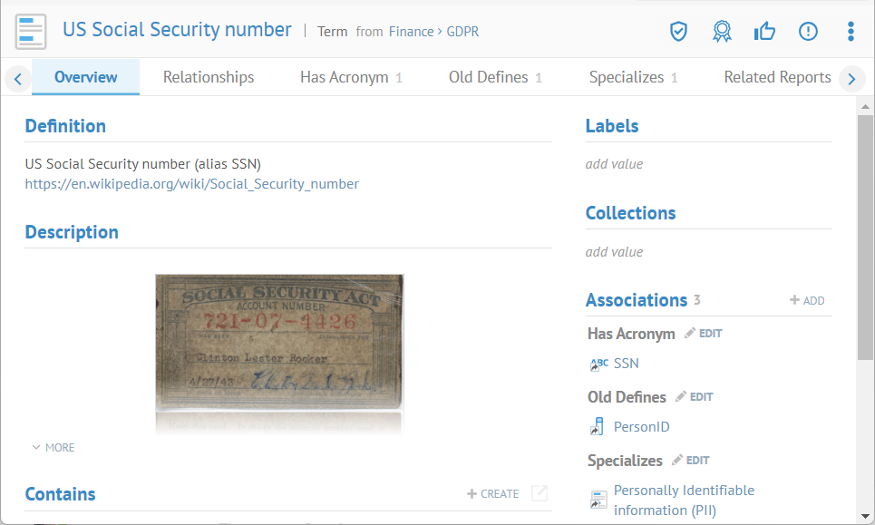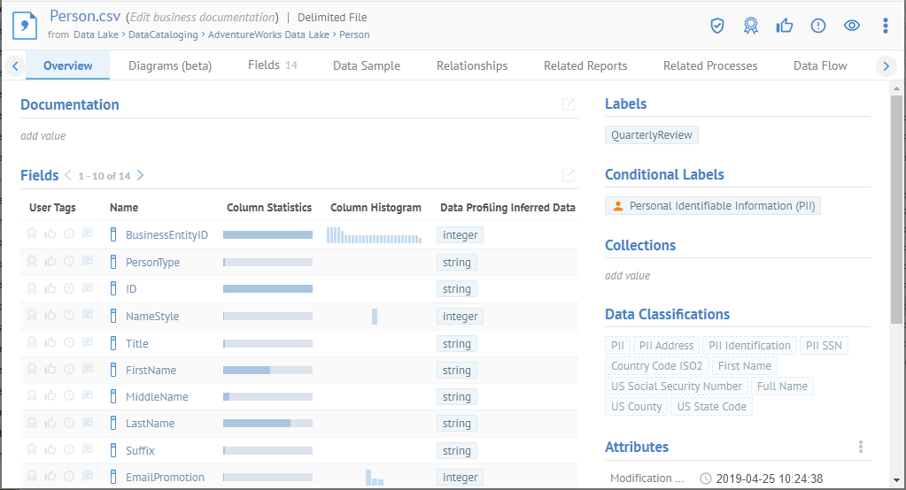 For example, a data class SSN can be associated to a sensitivity label Confidential or GDPR. In such case, any table columns or file fields detected as SSN will also automatically be set with that Confidential or GDPR sensitivity label. These may later be reviewed and approved.