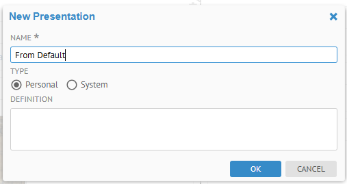 Customized presentations, may be personal or system type. You specify this type when saving (SAVE AS) a new customized presentation.