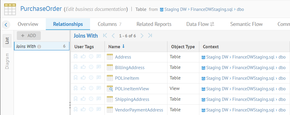 In this case we will navigate to the object page of the Customer table in the Staging DW database model, and click the Relationships tab.