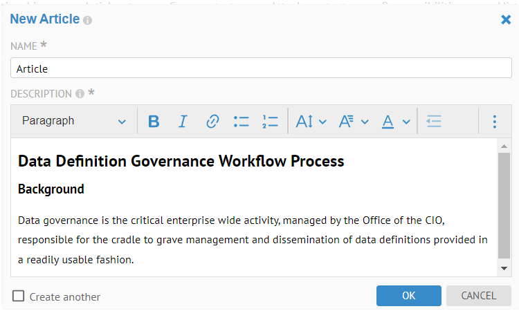Once you have created Finance Data Governance as an Articles custom model, you may add individual articles to it.