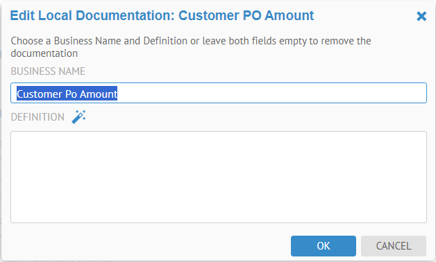 Local Documentation offers a local documentation with a business name and business description. This can be used as an alternative of the term documentation below, or a mean to supersede an existing term documentation with a better local definition.