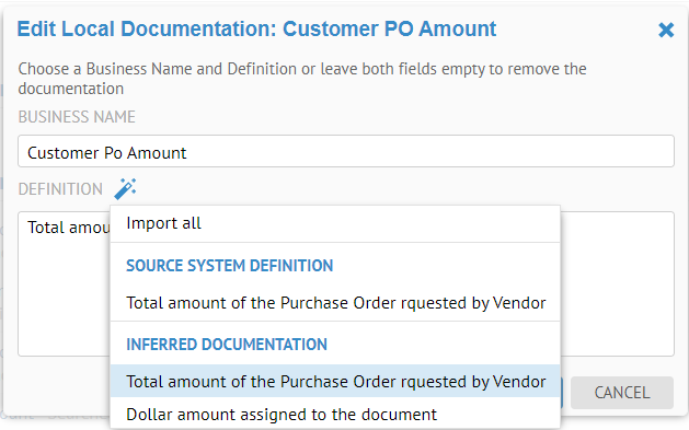 The BUSINESS DEFINITION will be pre-populated with any inferred description information.