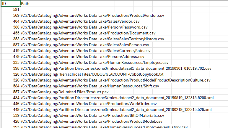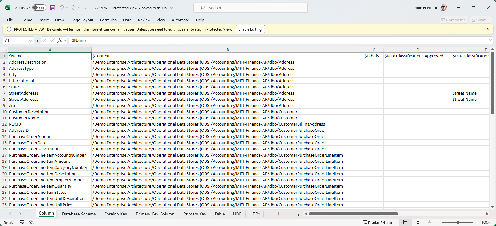 There are numerous files, one each for the type of contained objects in this single model. They are .csv files with the Business Name and Definition, Data Classifications, Sensitivity Labels as well as custom attributes in an editor.