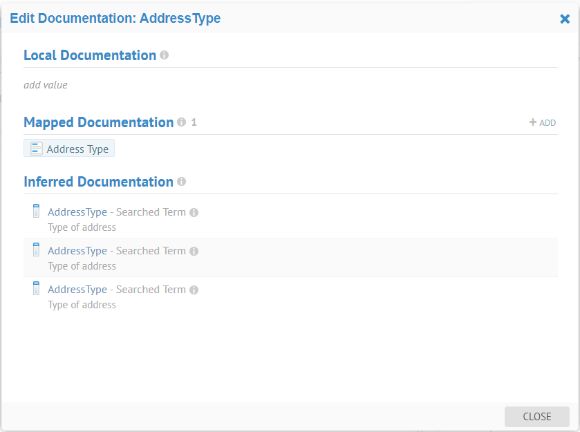 In the Inferred Documentation section of the dialog, click on the ADD button next to a line item to create a direct term documentation link to that term.