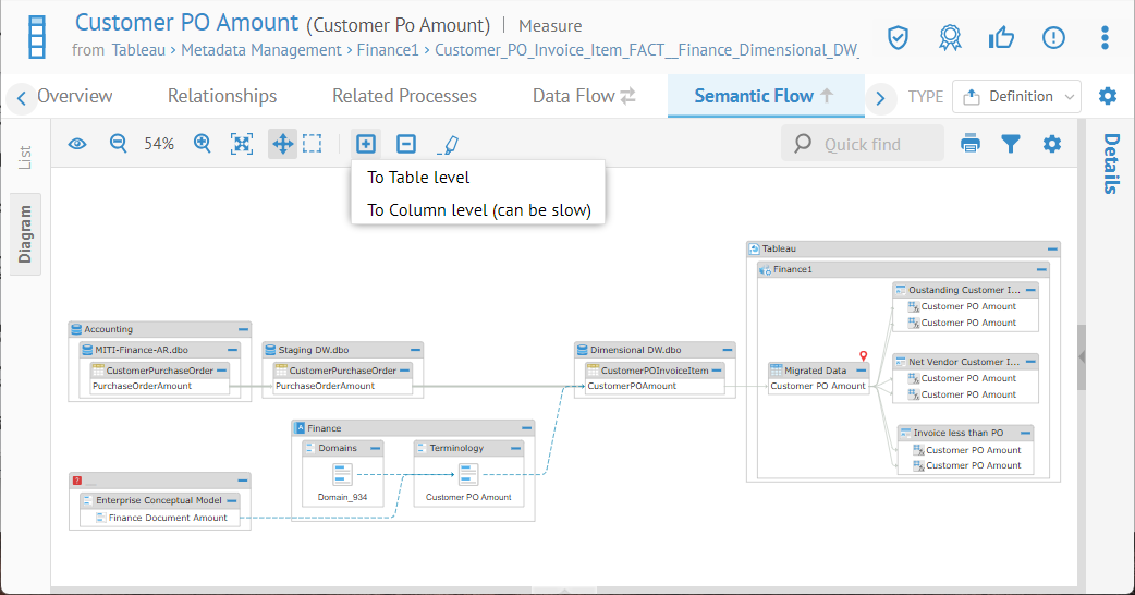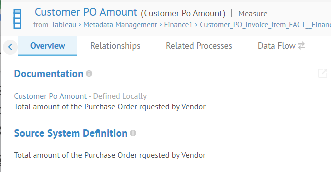 Navigate to the object page for the column Customer PO Amount in the Tableau report at Tableau > Metadata Management > Finance1 > Customer_PO_Invoice_Item_FACT__Finance_Dimensional_DW_ > Customer PO Invoice Item.
