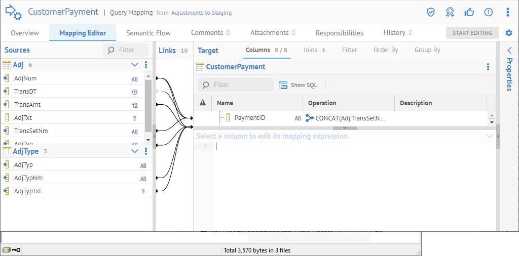 Finally, generally the best practice, when you are NOT using the data mapping editor to make changes but instead editing the data mapping script source, is to import into a model (not a data mapping model) and thus creating an ETL/DI model that can be stitched and take advantage of support for change and configuration management.