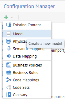 Go to MANAGE > Configuration and select the data mapping script model you plan to import into or create a new model using the Data Mapping Script import bridge.