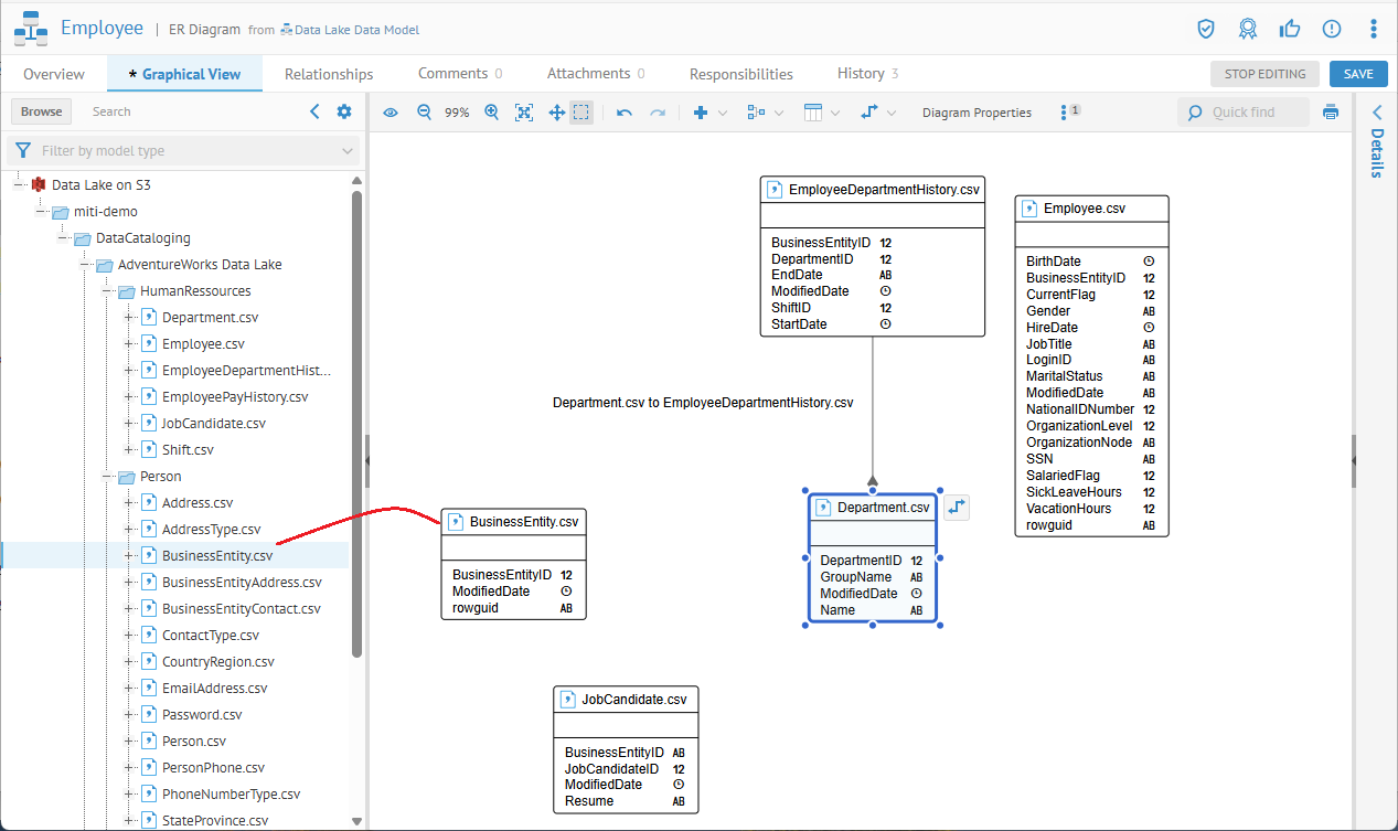 An entity relationship to EmployeeDepartmentHistory.csv which we created earlier via this diagram and data model.
