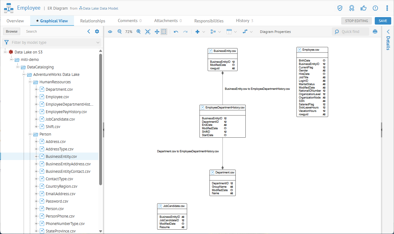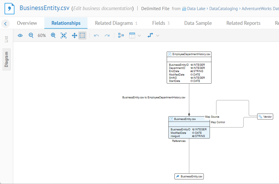 Click STOP EDITING and then click SAVE to save the diagram and then right-click BusinessEntity.csv and select Open and go to the Relationships tab.