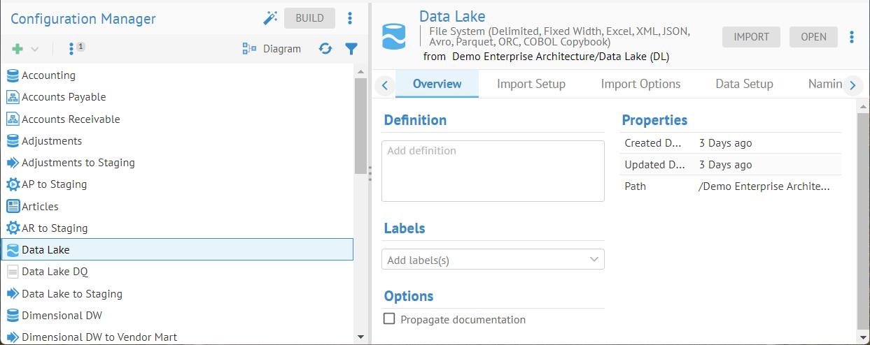In this case, we will import from the Meta Integration Data Quality format directory. The data quality information will be for the Data Lake file system files. Thus, the Data Lake model is already imported and in the configuration: