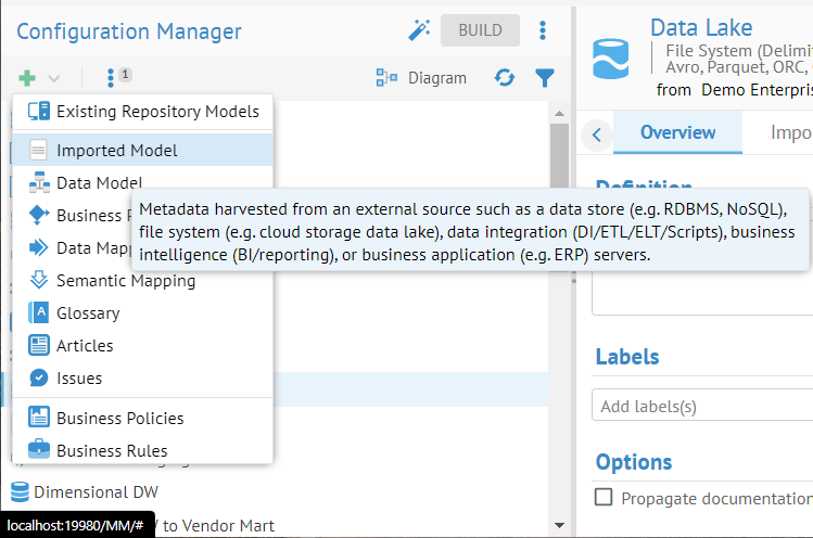 - Create a new Imported Model using the data quality import bridge for the particular source of that data. In this case, we will import from the Meta Integration Data Quality format directory.