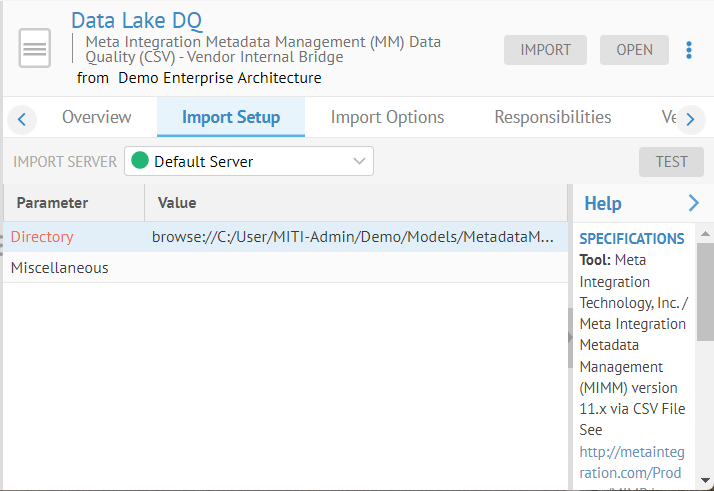 So, import the data quality model to be named "Data Lake DQ" using the Meta Integration Data Quality import bridge.