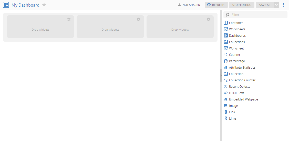 Log in as Administrator. Go to DASHBOARDS > Manage and click Create. Enter "My Dashboard" in the Name text field. Choose the three-column Layout.