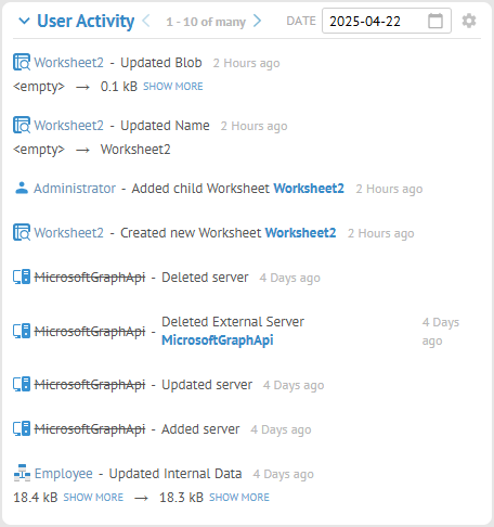 You may perform all the MANAGE > Dashboard functions on multiple worksheets in the grid by multi-selecting. The Show actions control is then presented in the grid header with the number selected.