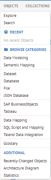 You may specify a persona (e.g., All Objects or Data Inventory) in the pull-down to the left of the search box to set the basis or scope with initial filtering of objects in the explore tree.