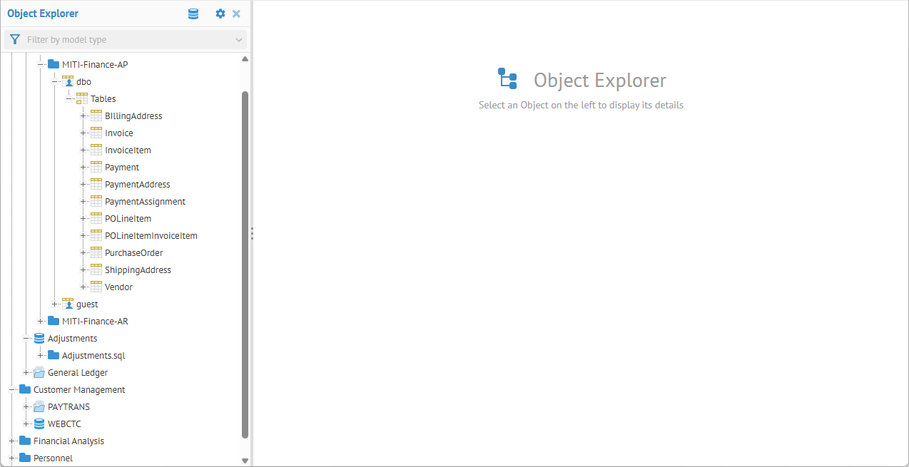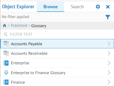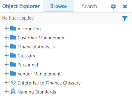Once in the Object Explorer panel, you may use the Browse tab and navigate the hierarchical structures in the configuration. This Browse functionality provides a single hierarchy that may be navigated down to the lowest level of granularity (e.g., fields in a file, or columns in a table) without stopping at the model (harvested) level.