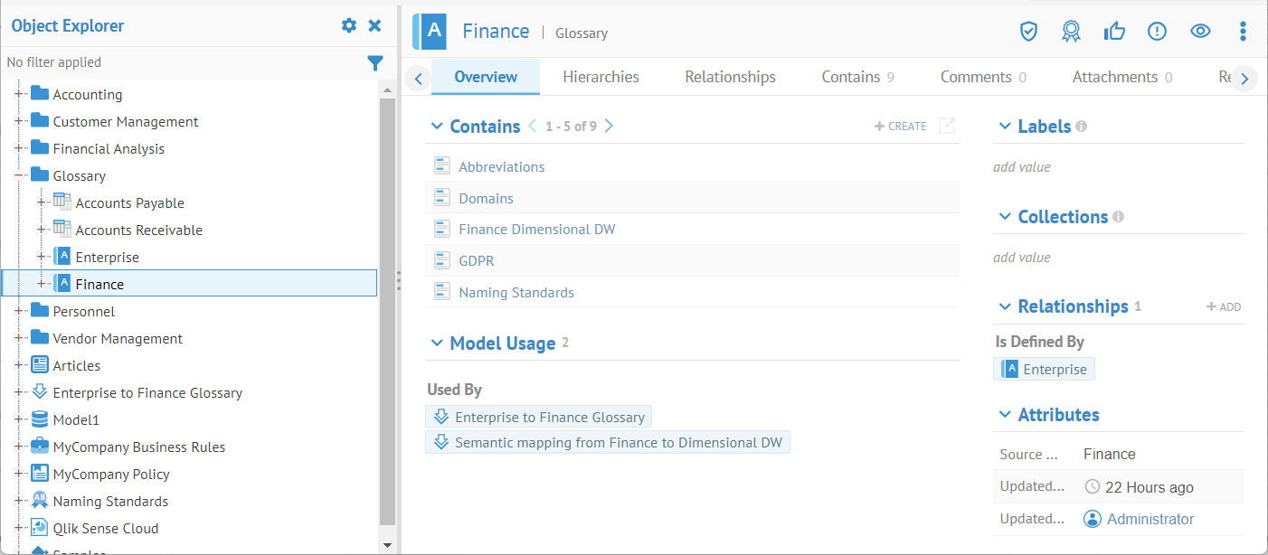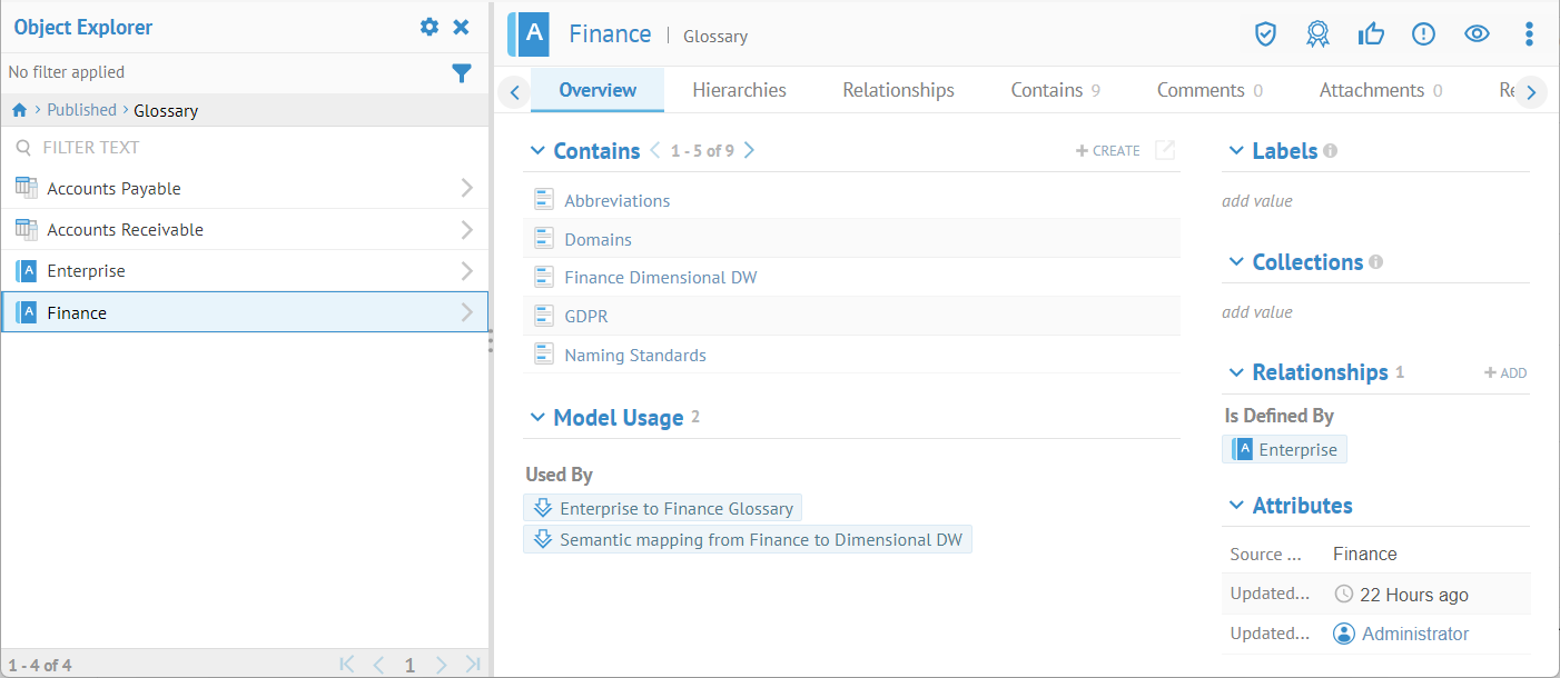 To restore the tree, simply click OBJECTS again. If you click on another item in the tree, you will be taken to that element's object page. However, the reverse is not true. If you navigate from the object page to an item, the Object Explorer panel does not update. Instead, you may use the Show in Object Explorer option in the upper right.
