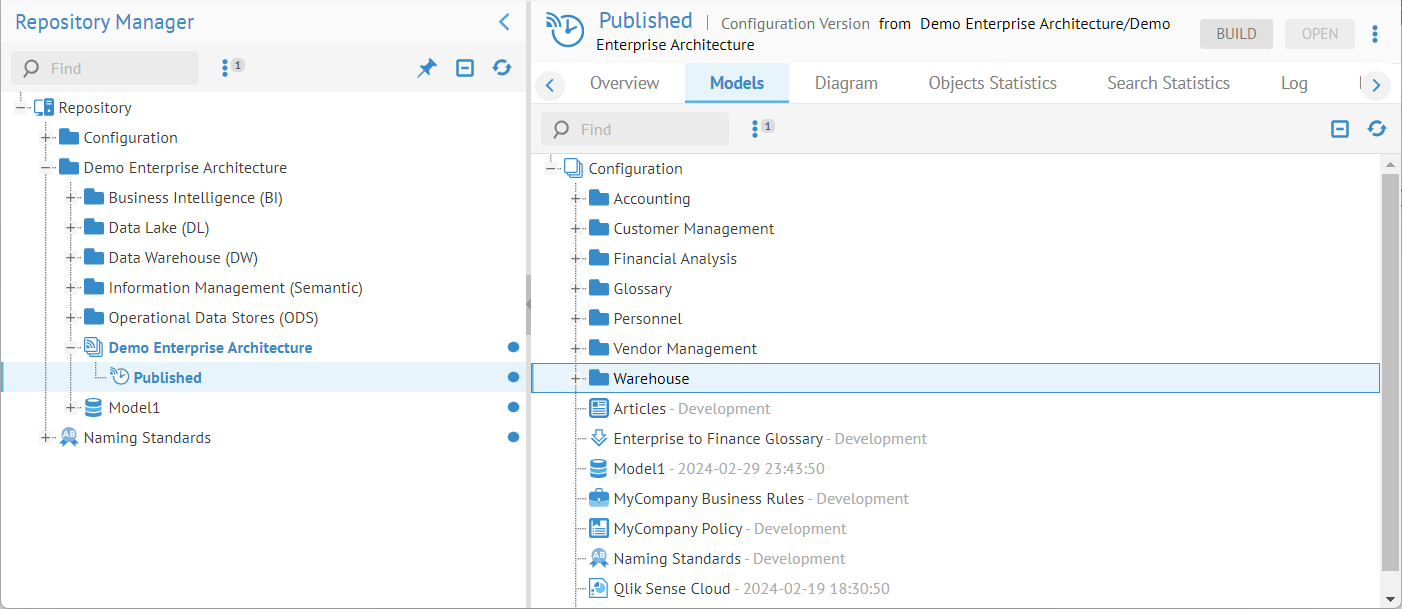 Repository -- Displays the tree using the structure of folders and models defined in the repository.