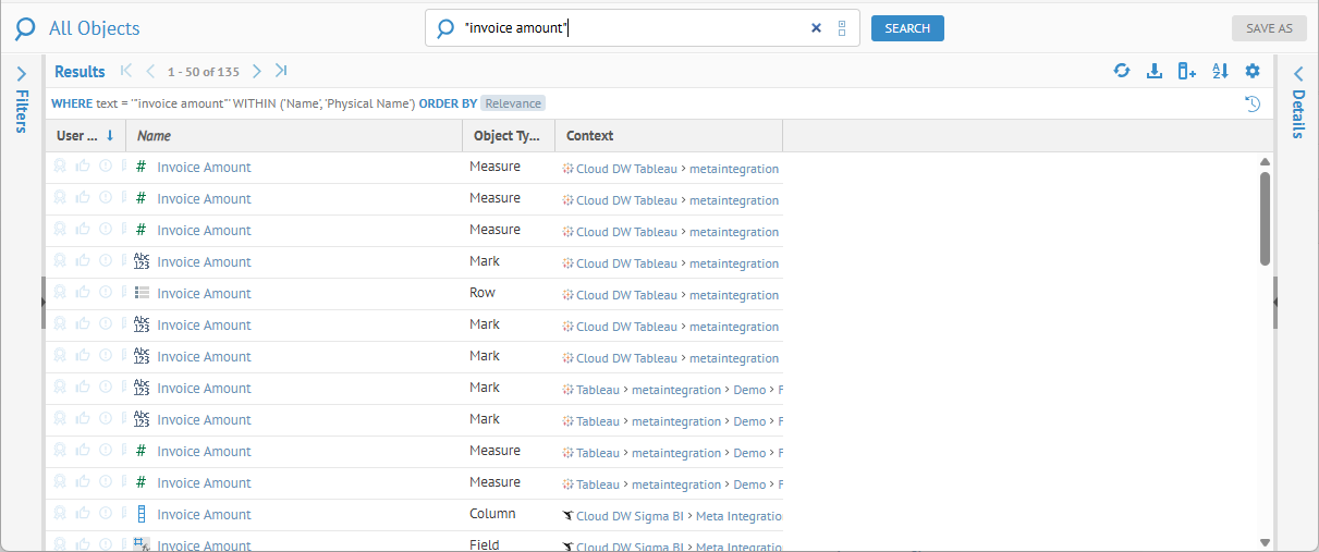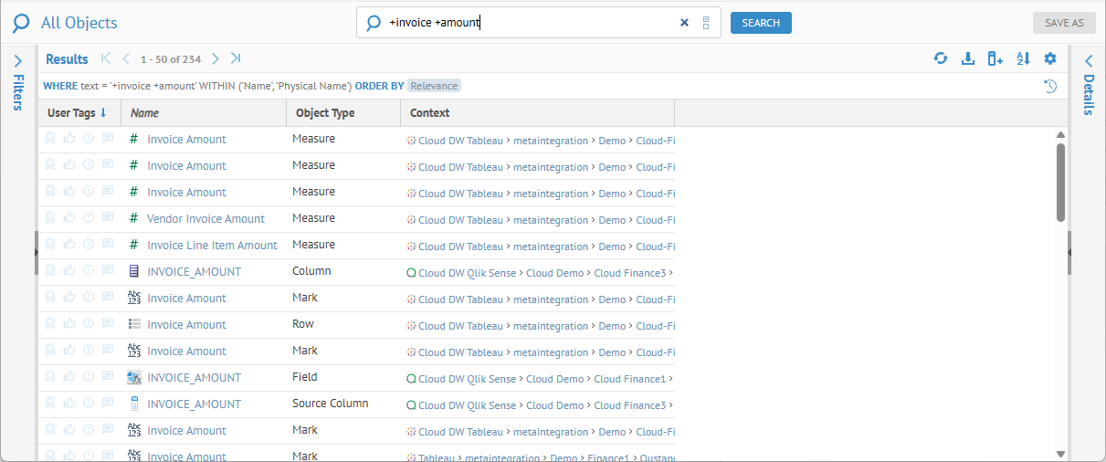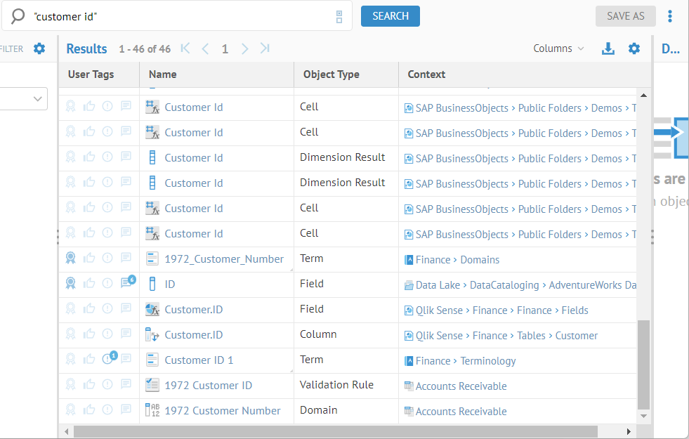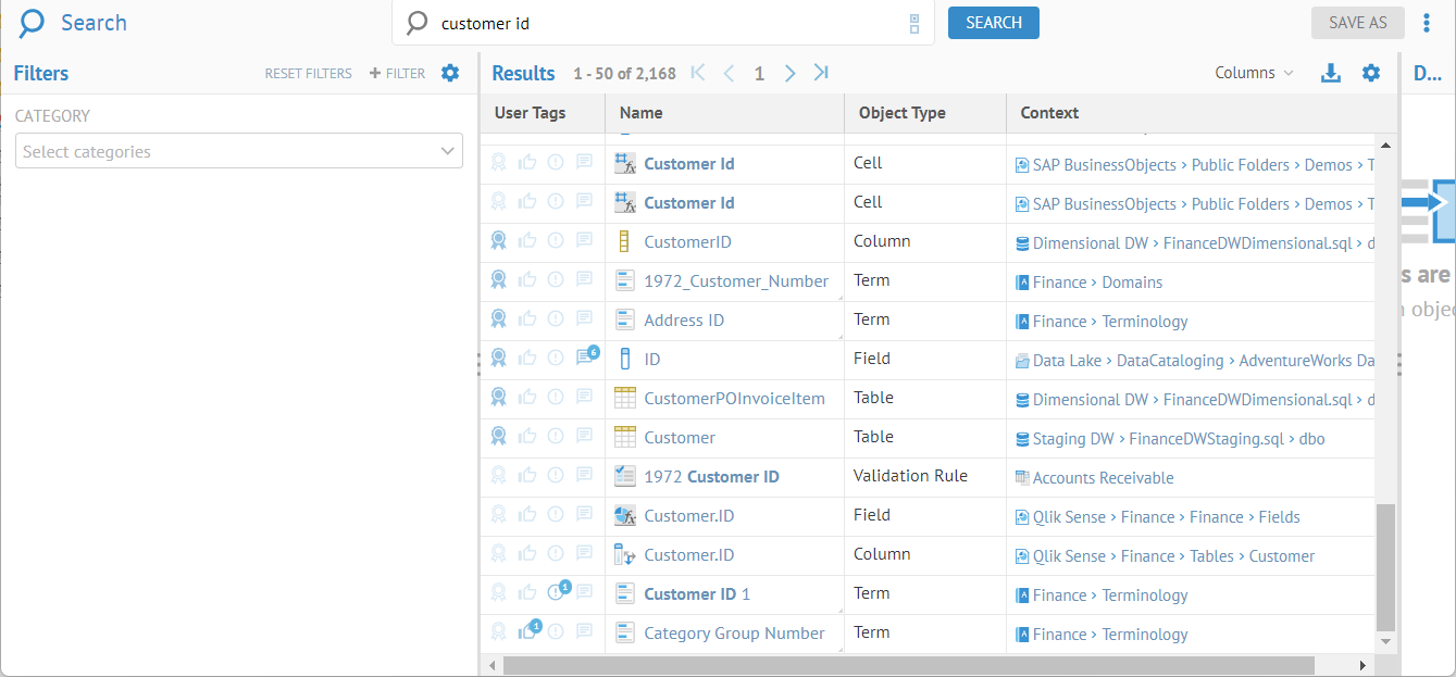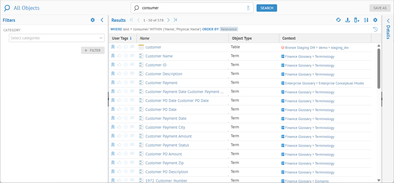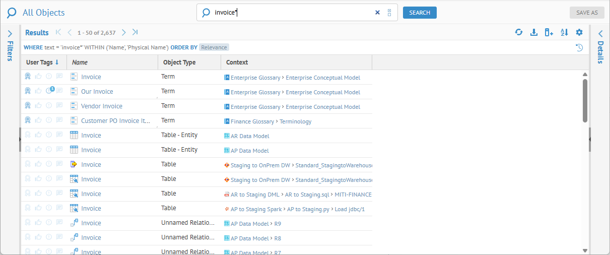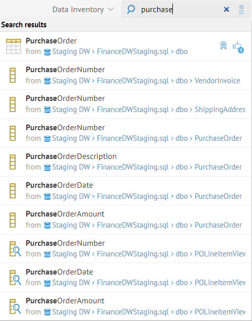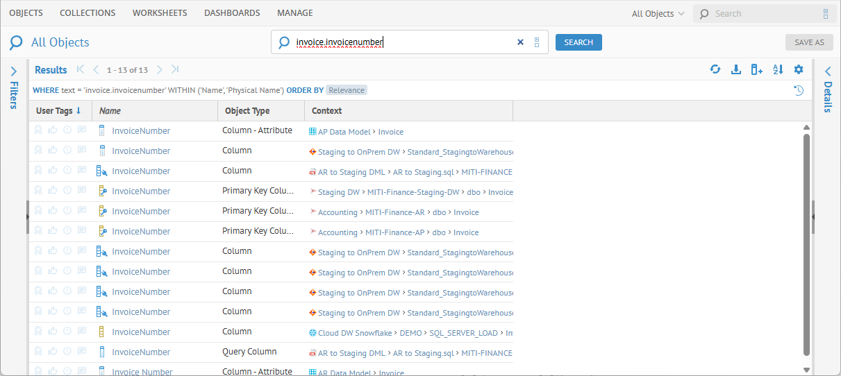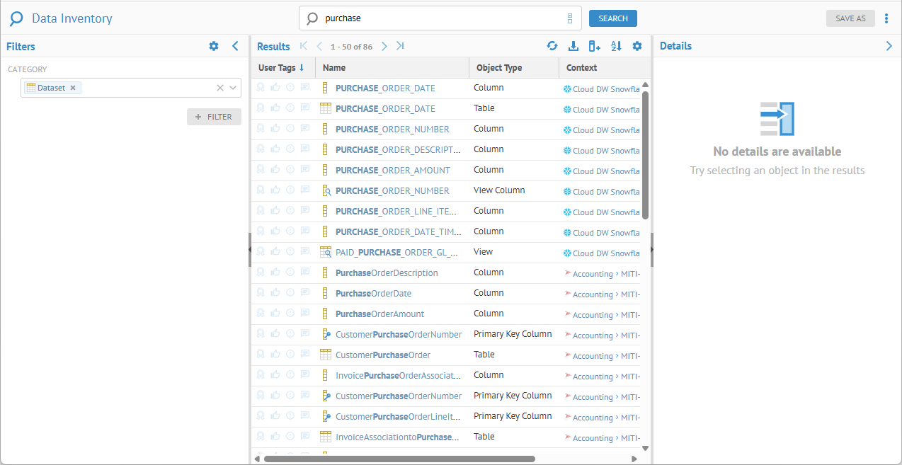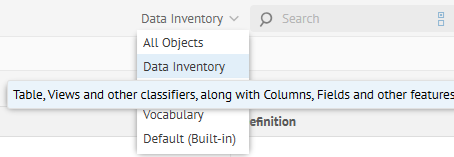The results have changed, as the Data Inventory persona pre-filters the results, where All Objects did not. With the Data Inventory persona selected, only columns and tables (or their equivalent) are displayed, whereas we saw relationships, etc., with All Objects.