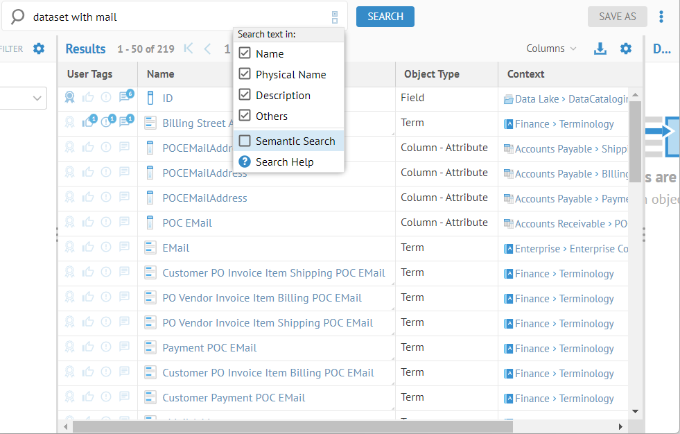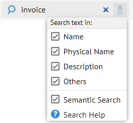 You may specify a persona (e.g., All Objects or Data Inventory) in the pull-down to the left of the search box to set the basis or scope with initial filtering of the search results and explore results.