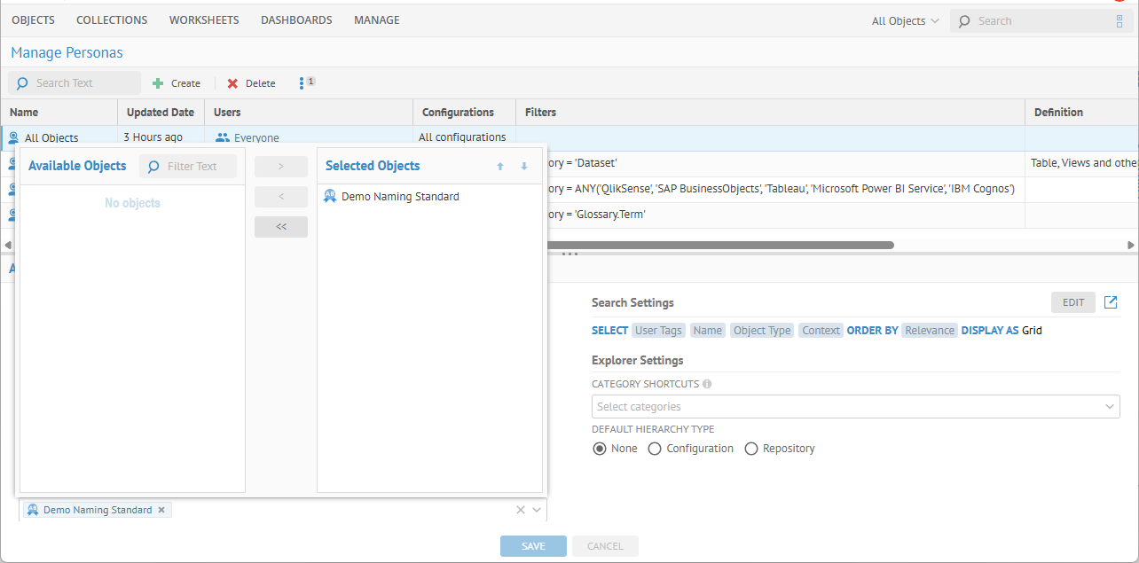 Once a persona is chosen, that all search results and model browse (in OBJECTS > Explore) results will be filtered to match the criteria in the persona. This functionality gives administrators a powerful tool to personalize and tailor users' search and browsing experience, enhancing focus and relevance.