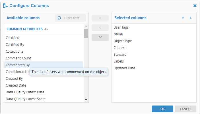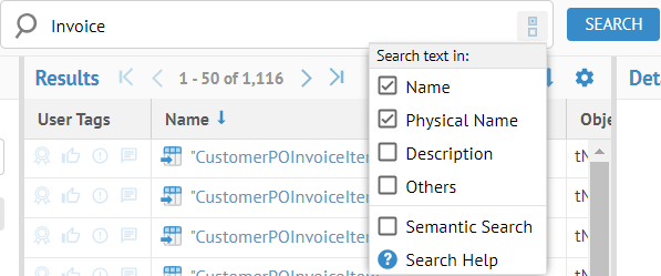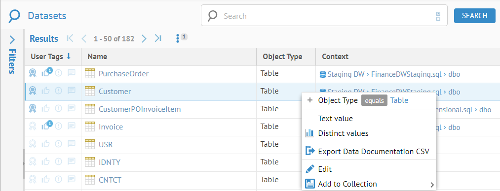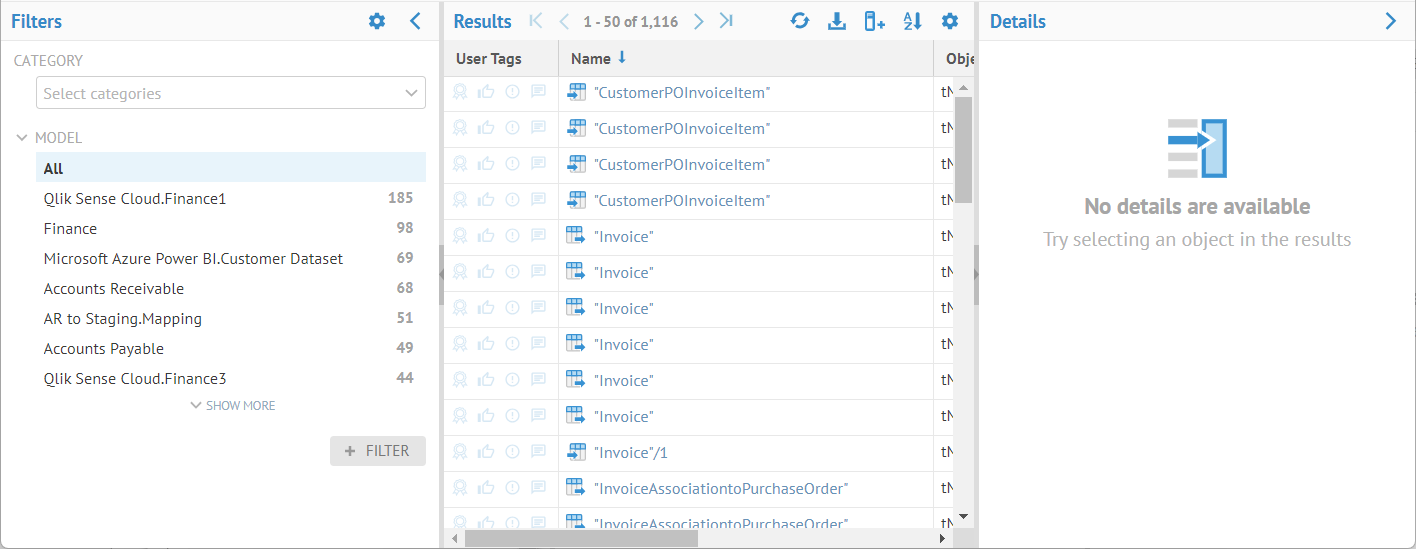 The worksheet capabilities offer you the ability to select multiple object types (e.g. database / tables + Flat files) and subset by model (My Data lake + Sales DW database) before drilling down with a large number of filters: