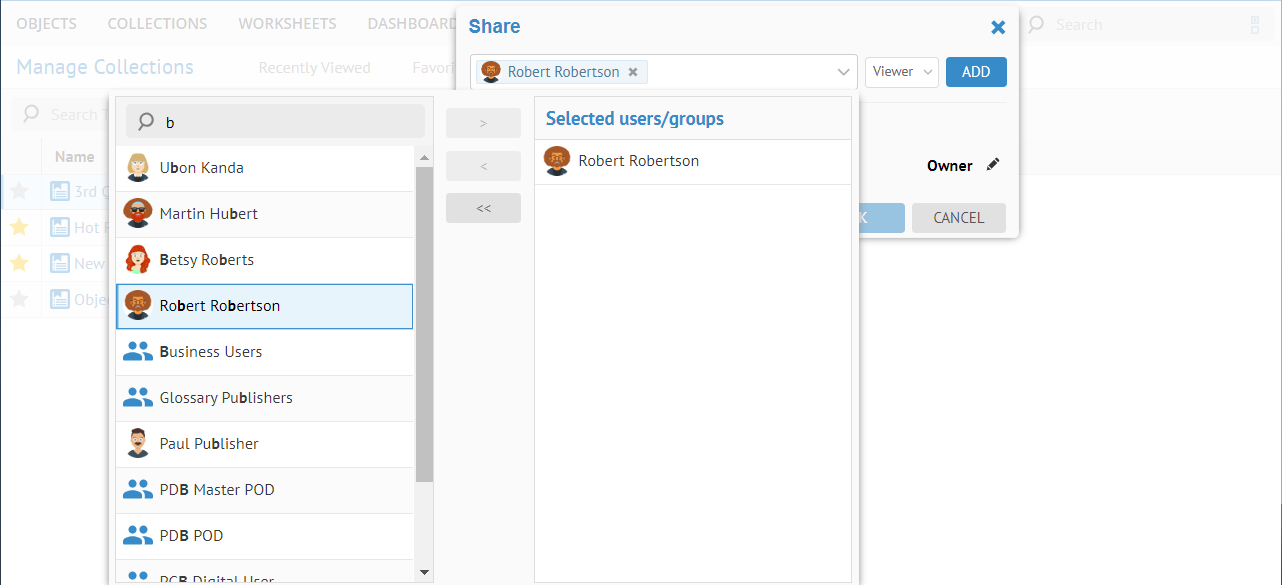Double-click in the Viewers cell and pick the user Bob to assign the sharing role.