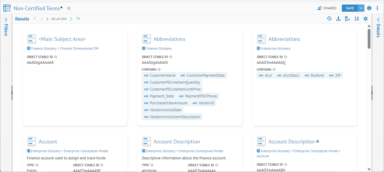 DISPAY MODE to toggle among the List mode (with name and definition) the Grid mode (allowing multiple header columns and sort order by column) and the Card mode (individual cards for each object along with property values for each header column)