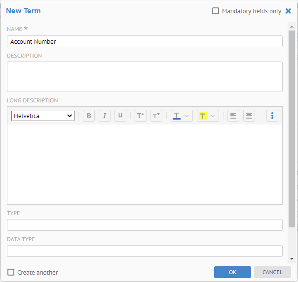 You now see all the possible attributes to set for the new term. The Mandatory fields only checkbox controls whether you may enter the non-mandatory attributes as well, or simply the mandatory attributes when create a new custom object.