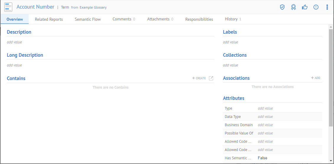 Sign in as Administrator and navigate to the object page of the term Account Number in the Example Glossary. Then click the Add plus sign in the Associations section.