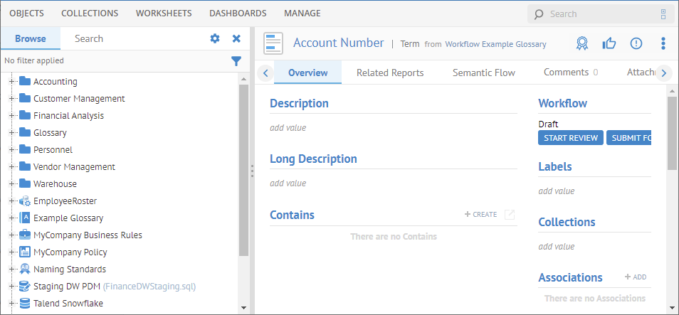 Remember, a glossary is just of an example of a custom model. In this case it is based upon the Glossary model type. As it is a custom model, you may customize it. Also, these same workflow processes may apply to any object type in the metamodel.
