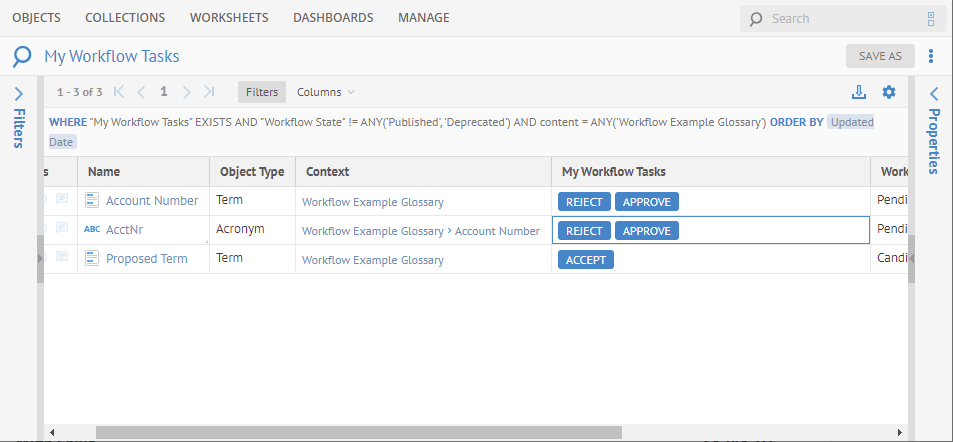 We see there are three objects to shepherd through the workflow, and we completely forgot about one of them, i.e., the acronym we created.
