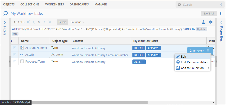 When analyzing metadata in grid mode you may include a special column Workflow Actions to display the possible workflow step-based actions available to you with the workflow object role assignments you have.