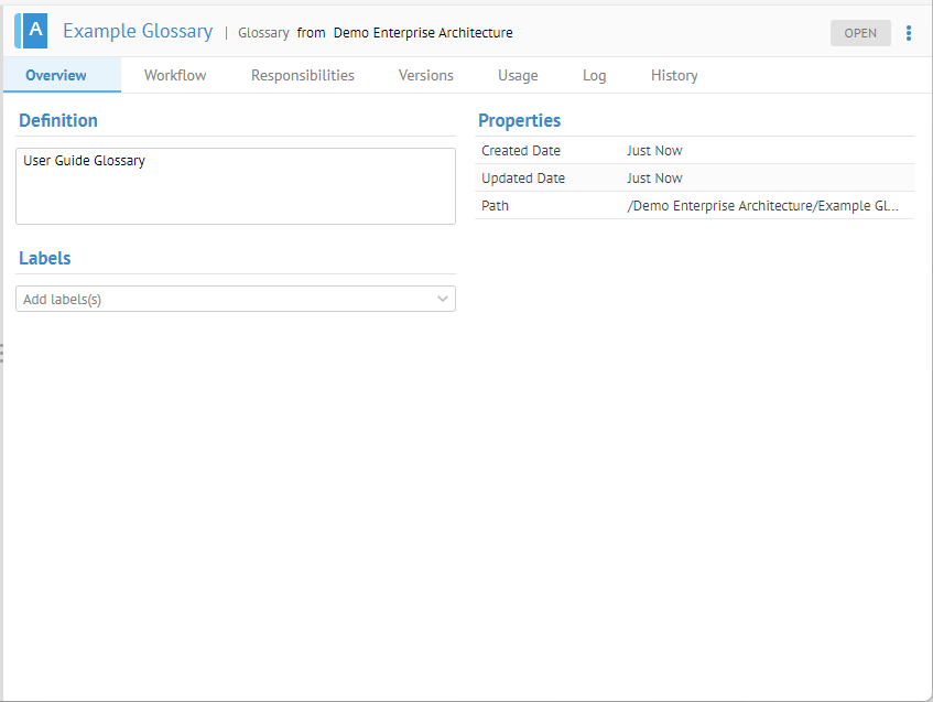 Click OPEN and you will see the object page for the glossary: