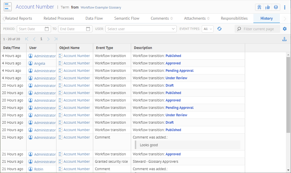The attributes on the legacy glossary terms will be converted to the attributes or roles of the new business glossary terms. For example, the Stewards attribute is converted to the Steward object role. The Abbreviation and Alternative Abbreviation attributes are converted to the Has Acronym roles. Acronyms are automatically created under an Abbreviations term under the glossary. The Status and State attributes are converted to the Workflow State and/or Workflow Deprecation Requested attributes if the glossary is under workflow. The Definition attribute is converted to the Description attribute. The Documentation attribute is converted to the Long Description attribute.