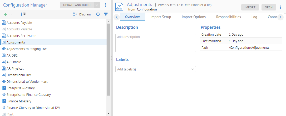 Once you have a configuration, you may manage the configuration. In particular, you may identify the models of the configuration, add and remove models, configure the import of models, stitch models together and review versions, import logs and responsibilities.