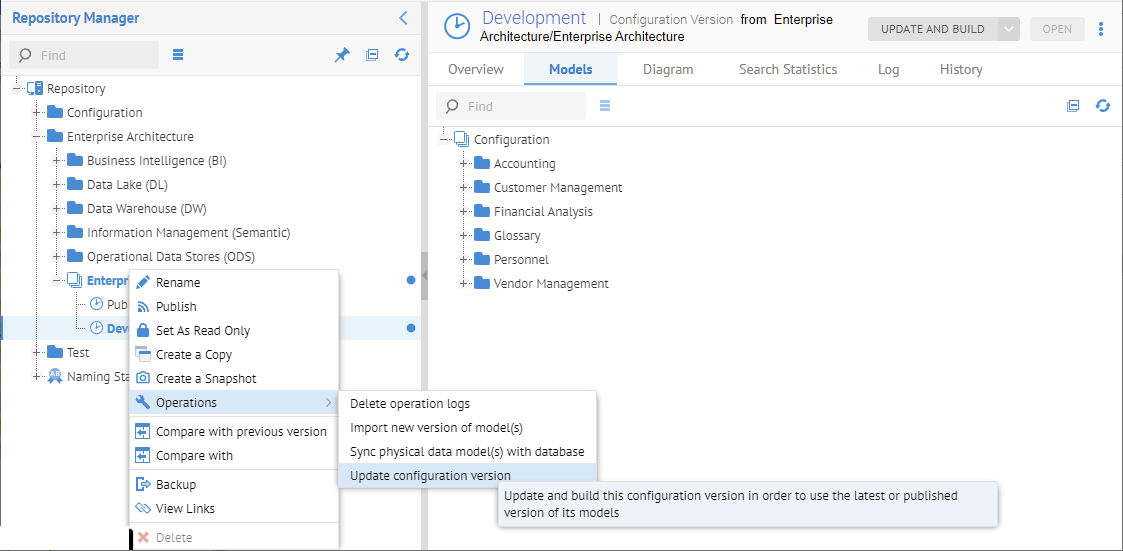 Just as you may define configurations for automatic update of new model versions which are contained in that configuration, you may use the Update and build option to do so manually. In this way, for each contained model, the latest version is included in the configuration. Then the configuration is Built as part of the process.
