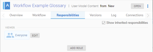 Sign in as Administrator and go to MANAGE > Configuration. Select the Workflow Example Glossary. Go to the Responsibilities tab.