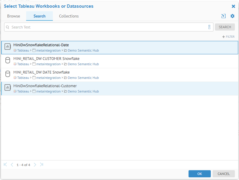 One example is the ability for the intelligent feature of the semantic model catalog to merge various models with related metadata which are derived from a reporting tool (e.g., Tableau) and: