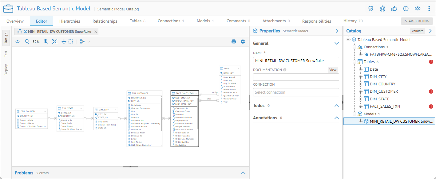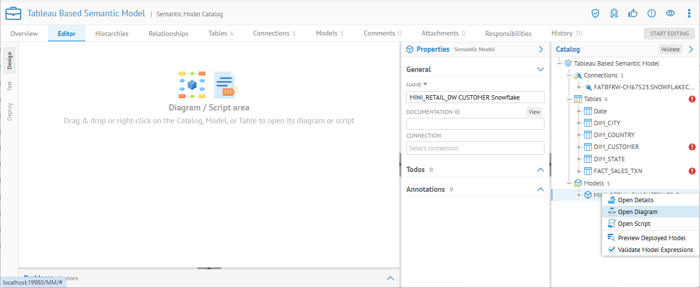 Right-click the MITI_RETAIL_DW CUSTOMER Snowflake (internal semantic) model and select Open Diagram.