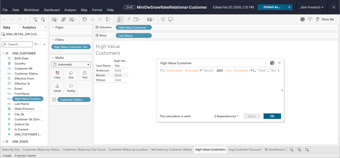| Metric only in Workbook Two (Customer) | High-Value Customer | ([Is Current] AND [[Customer Status]="GOLD") |
