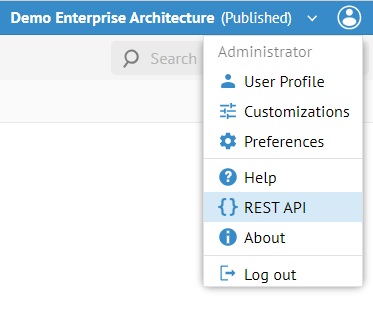 After restarting the MM Application Server, the REST API documentation is available within the UI by clicking on the user icon on the banner top right corner and select REST API (just below Help):